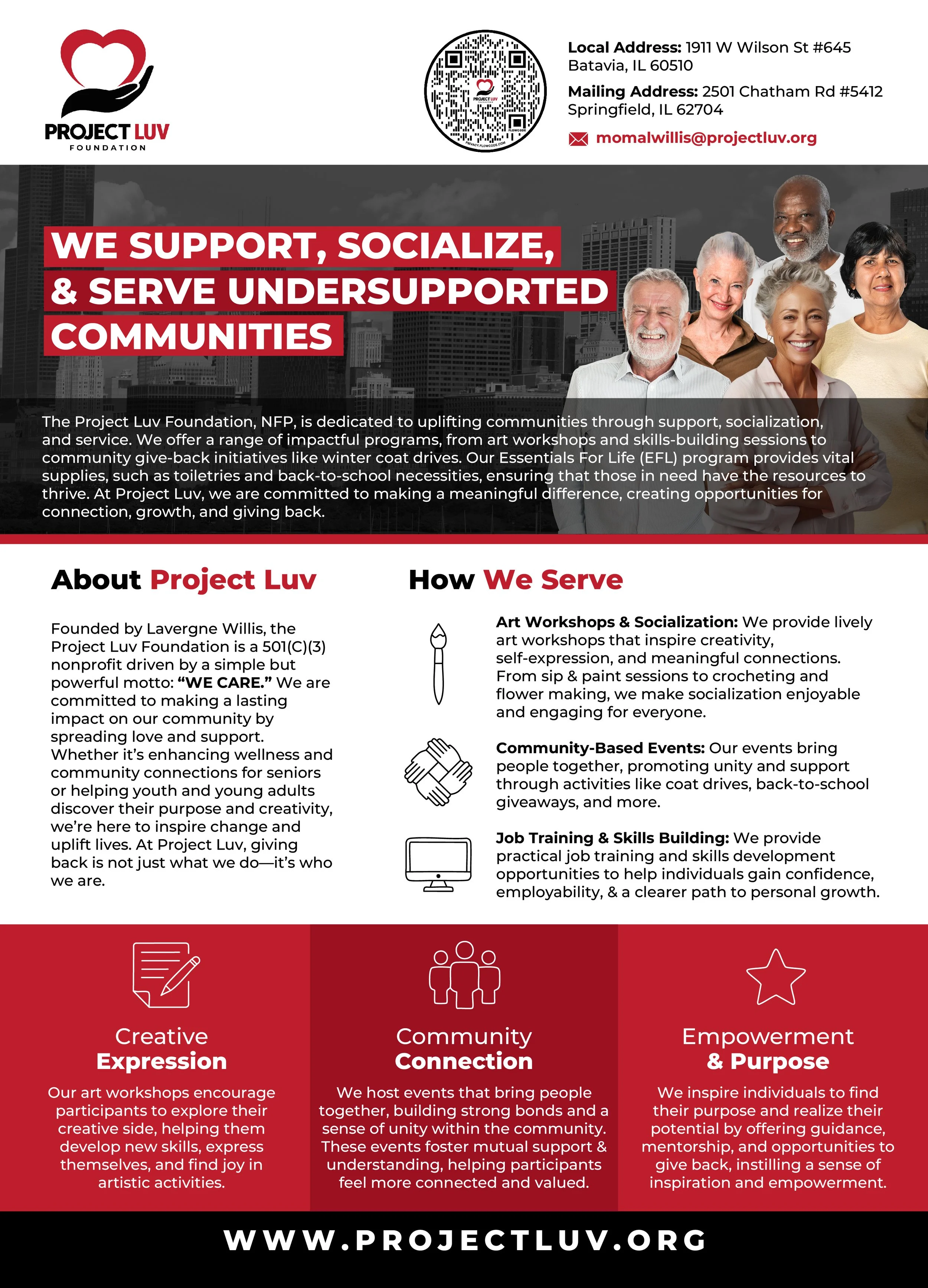 Founded by Lavergne Willis aka Moma Willis, Project Luv Foundation is a Chicago and Aurora, IL-based 501(C)(3) nonprofit that’s all about one simple, yet powerful motto: “WE CARE.” We’re here to make a difference by spreading love and lifting up our community. From boosting wellness and creating meaningful connections for seniors to helping youth and young adults discover their passions, we’re all about inspiring change and uplifting lives. At Project Luv, giving back isn’t just a mission—it’s our way of life.